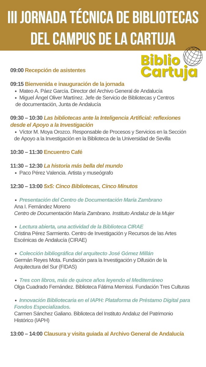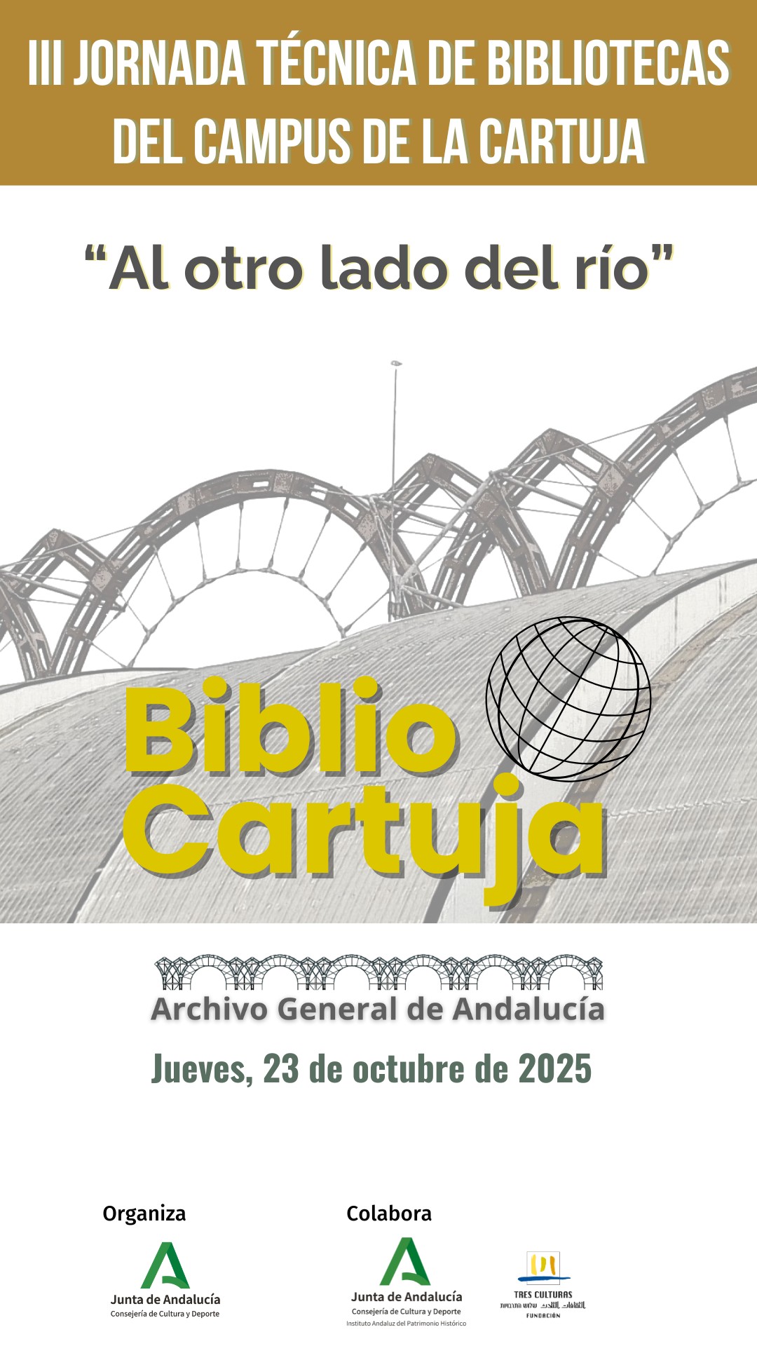 El jueves 23 de octubre de 2025 se celebra en el Campus de la Cartuja de Sevilla la III Jornada Técnica de Bibliotecas («BiblioCartuja»), promovida por el Archivo General de Andalucía, con el título de «Al otro lado del río». Este evento está organizado por la Consejería de Cultura de la Junta de Andalucía, con la colaboración del Instituto Andaluz de Patrimonio Histórico y la Fundación Tres Culturas.