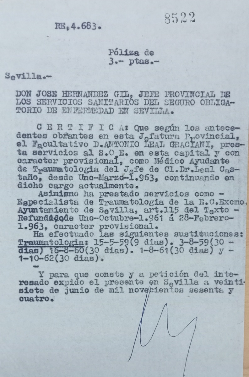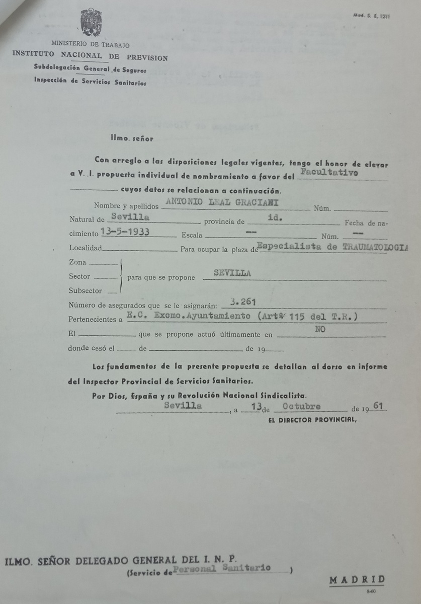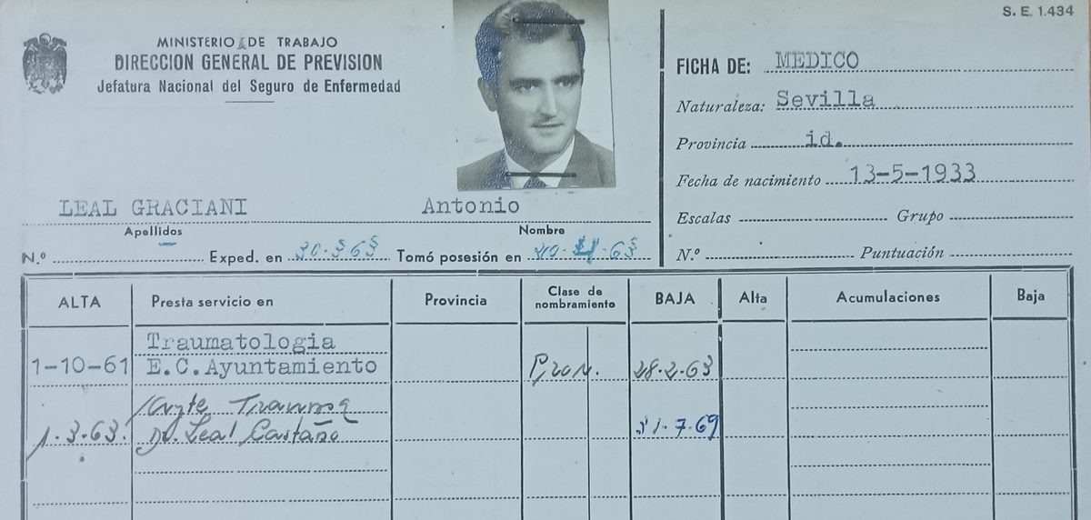 Nacido en Sevilla el 13 de mayo de 1933, Leal Graciani fue propuesto el 13 de octubre de 1961 por el director provincial del Instituto Nacional de Previsión, Mariano de Vicente Sánchez, al delegado nacional en Madrid, para ocupar, con carácter provisional, la plaza de especialista de Traumatología en Sevilla, con la encomienda de atender a 3.261 asegurados pertenecientes al Ayuntamiento (5). Este médico había sido autorizado para iniciar esta actividad el 1 de octubre anterior. La propuesta de su contratación había partido del propio Consistorio. Al día siguiente, el propio director provincial comunicó al doctor que quedaba adscrito al jefe de clínica, Julio Acal de la Cámara, con consulta en el ambulatorio de la calle José Gestoso, nº 19. El 16 de octubre remitió a la inspección provincial la ficha con sus datos personales, y el 24 de noviembre el subdelegado general de la Seguridad Social le autorizó para desempeñar el puesto de manera provisional. El 6 de diciembre, el inspector provincial le comunicó este nombramiento. Se colegió con el número 2426 (6).
